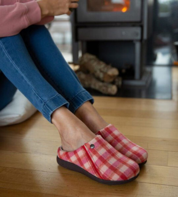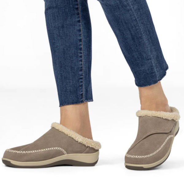 Do you need to wear an orthotic at all times? Slip them into these comfortable slippers by Orthofeet with no problem. The Charlotte slipper/house shoe also features a wide toe box, excellent arch support and a mild rocker sole to take pressure off the forefoot. An adjustable instep closure allows for customized fit. Available in sizes 5-12, medium to extra wide width for $89.95 from Orthofeet.com and Amazon.