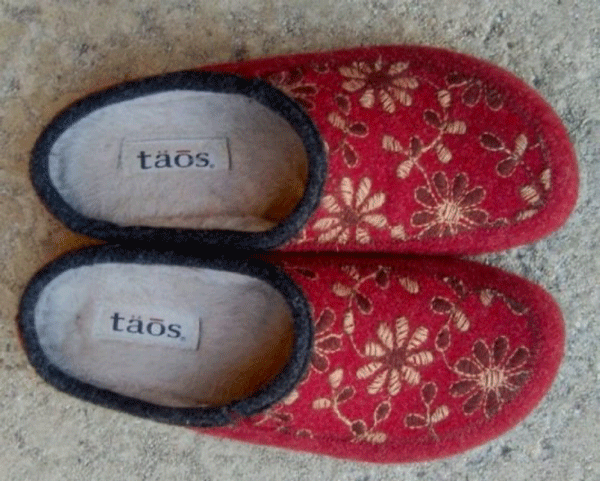 I’ve worn my pair out and about as shoes with jeans or leggings. I’ve also worn them as supportive slippers around the house. The Taos trademark “Curves and Pods” footbed is heavenly, providing decent arch support and terrific cushioning for the heel and forefoot.