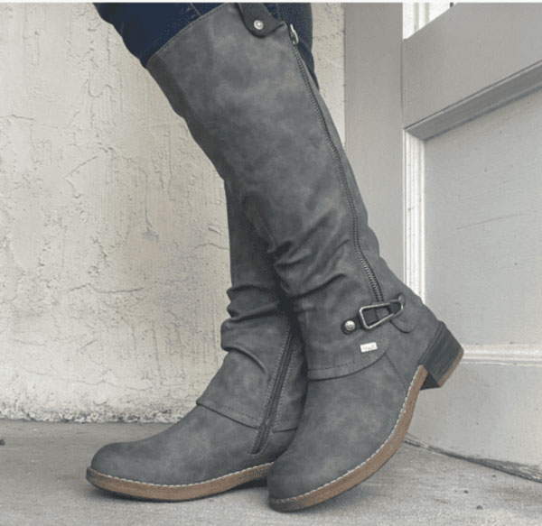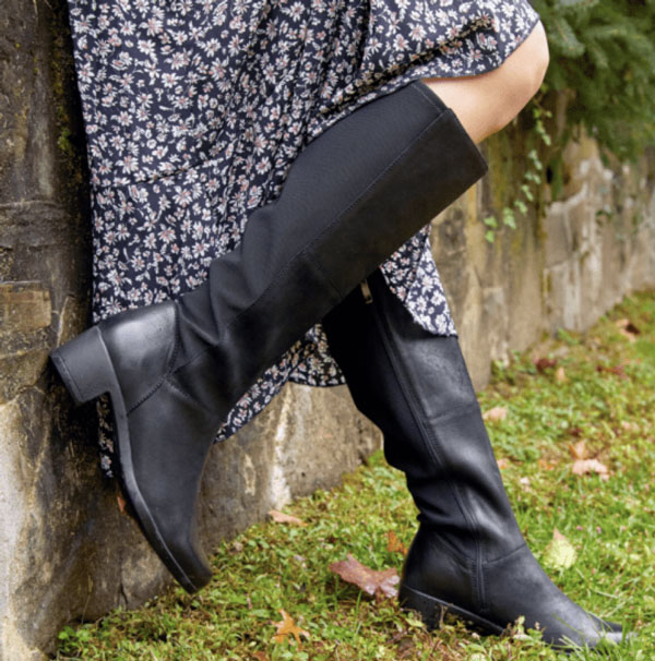 Beautiful yet comfortable tall boots, podiatrist-designed Frankie4 delivers again! The Brooke features genuine leather uppers with a stretch back panel, .9 inch heel and removable chain. Each pair of Frankie4 shoes and boots comes with a Sole Saver Pack® which includes a full-length Sole Hero Support Footbed, a half-length Sole Hero Support Footbed, and forefoot cushions. Available in sizes 6-13 for $299 from Frankie4. See their entire collection of comfortable tall boots here.