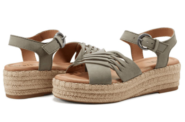 If slides aren’t your style or you prefer a real buckle to velcro, this platform espadrille sandal is for you. The Earth Hilda features premium leather criss-cross straps, plush insole, 2″ heel with a 1.5″ platform. Find it in sizes 5-12 for $49-99 from EarthShoes.com and Nordstrom.