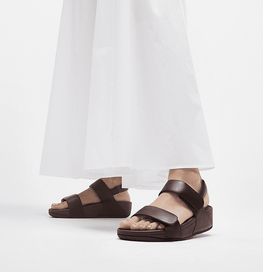This is just one of many Fitflop Lulu styles, but we endorse it because of the ankle strap which helps secure the heel. The MicroWOBBLEBOARD™ EVA midsole features a high-density heel, low-density midsection, and mid-density toe cap that provides arch support and firm cushioning. Available in sizes 5-11 for $68-110 from Fitflop, Zappos, Amazon and Nordstrom.